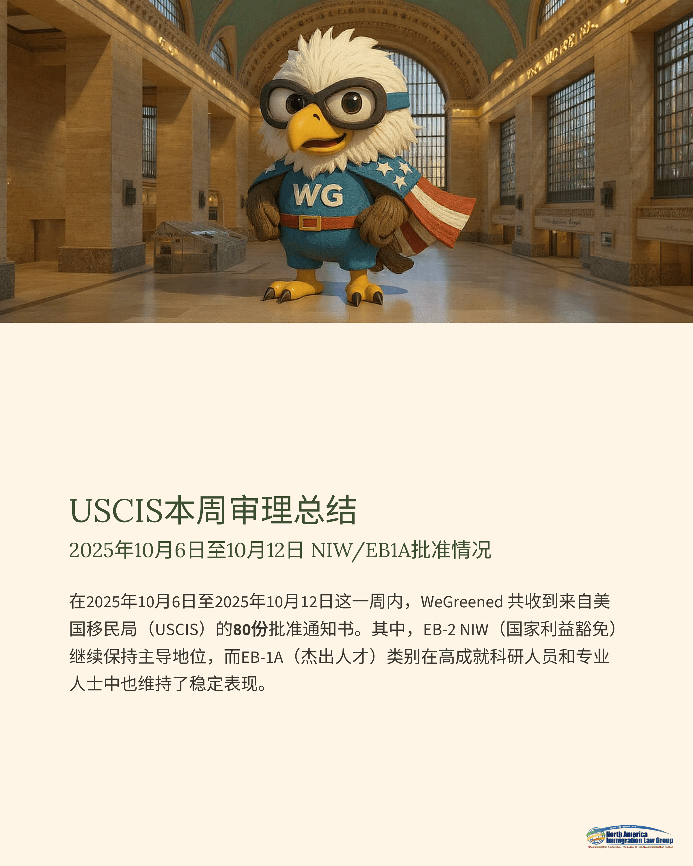 在2025年10月6日至2025年10月12日这一周内,WeGreened 共收到来自美国移民局(USCIS)的80份批准通知书。其中,EB-2 NIW(国家利益豁免)继续保持主导地位,而EB-1A(杰出人才)类别在高成就科研人员和专业人士中也维持了稳定表现。