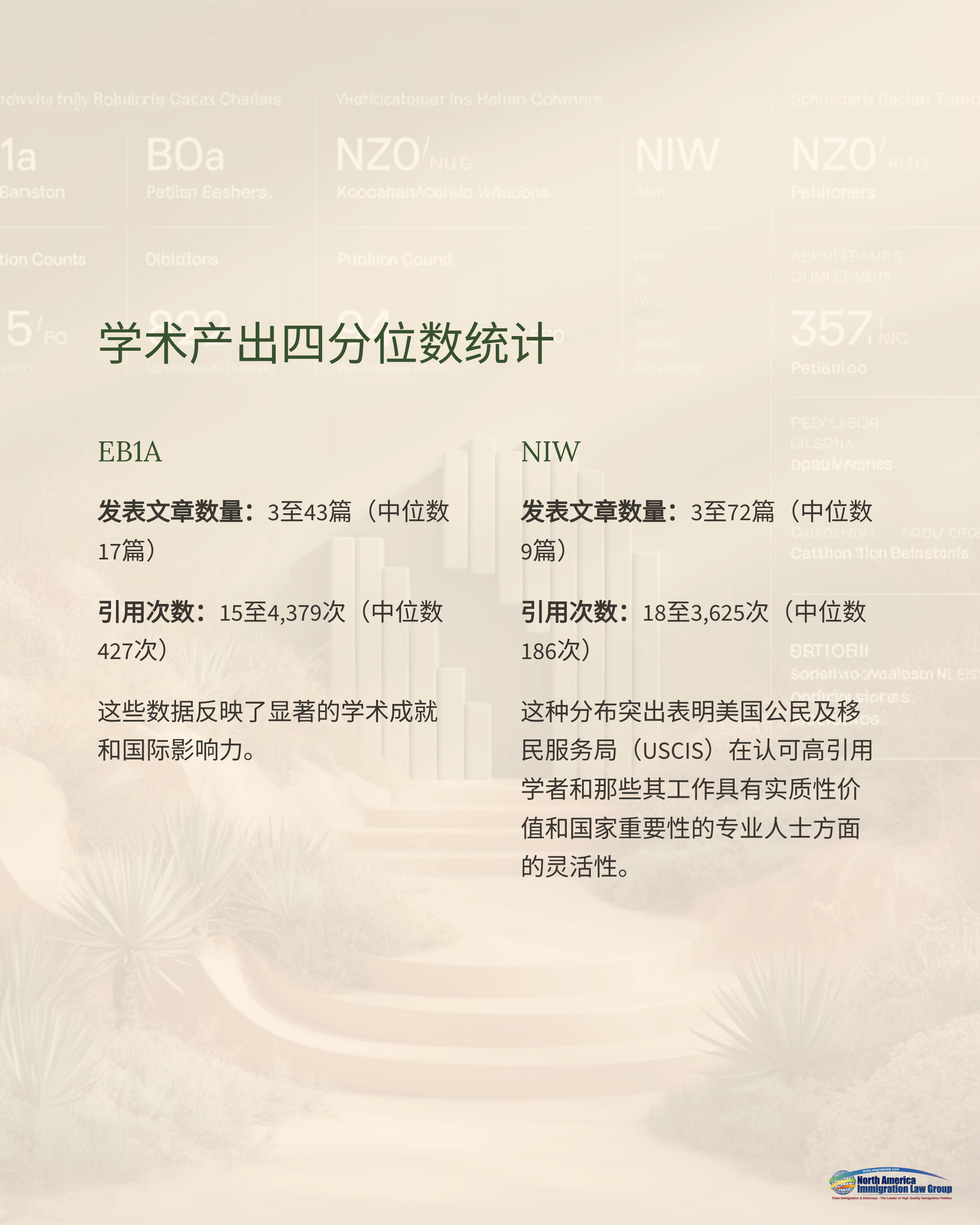 EB1A申请人普遍具有较高的学术产出与国际影响力;NIW则呈现更多元的背景与领域,更强调研究与实践对美国国家利益的直接贡献。