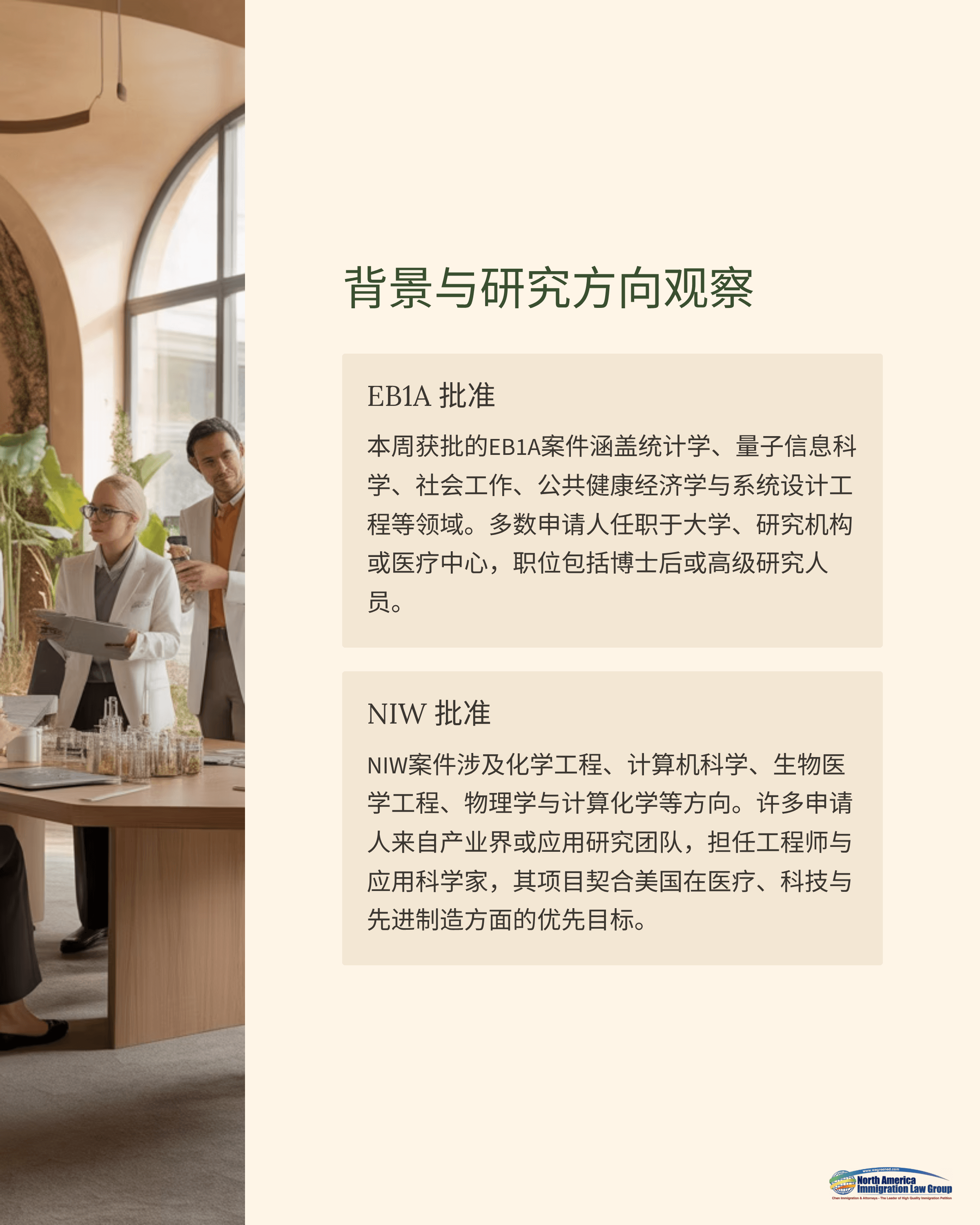 本周获批的EB1A案件涵盖统计学、量子信息科学、社会工作、公共健康经济学与系统设计工程等领域。多数申请人任职于大学、研究机构或医疗中心,职位包括博士后或高级研究人员。