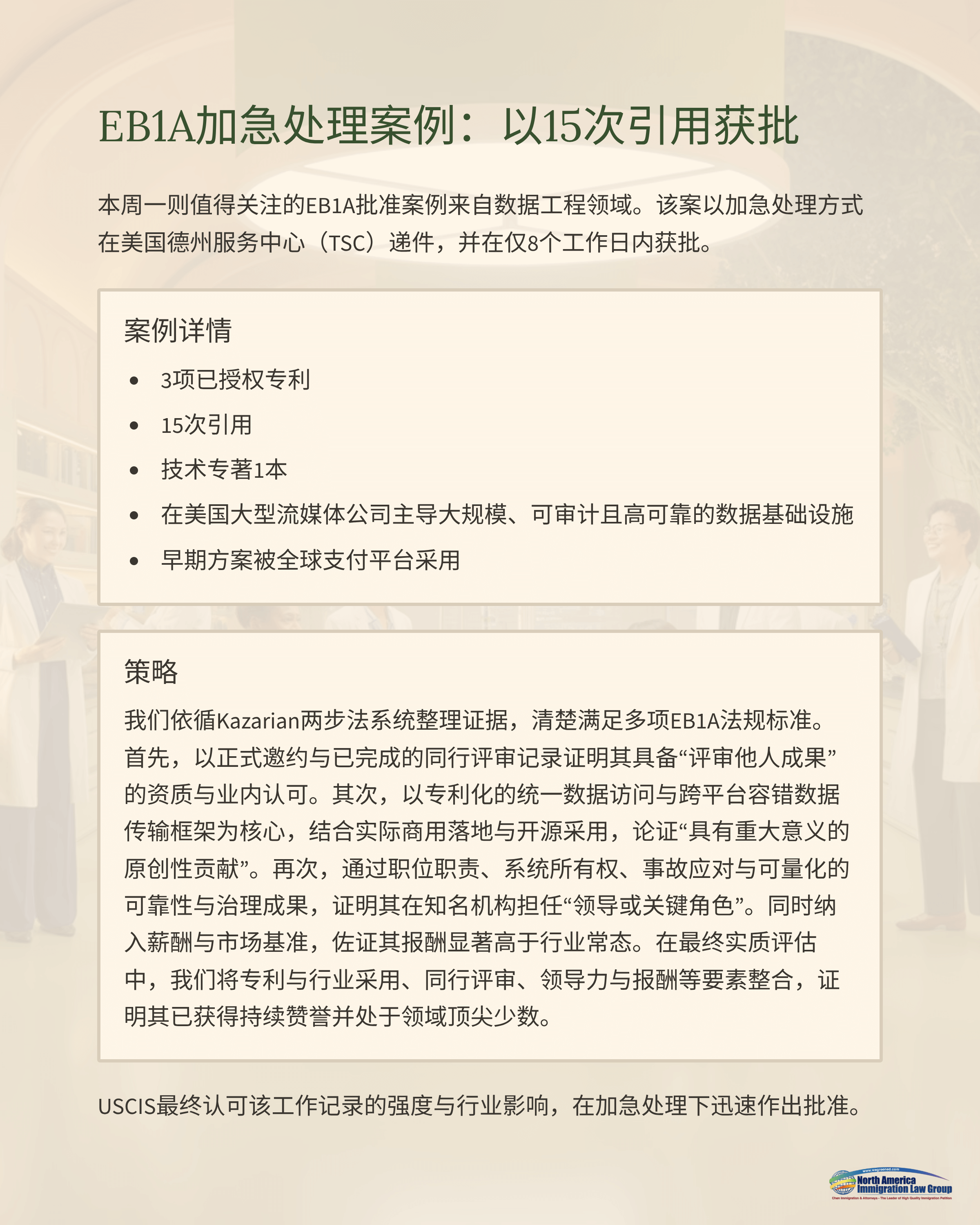 本周一则值得关注的EB1A批准案例来自一位资深数据工程专业人士。其学术与专业记录包括15次引用、3项已获授权专利以及一本第一作者技术专著。该申请人在一家美国大型流媒体公司负责搭建大规模、可审计且高可靠的数据基础设施,先前开发的解决方案亦被一家全球支付平台采纳。本案以加急处理方式提交,并在仅8个工作日内获批。