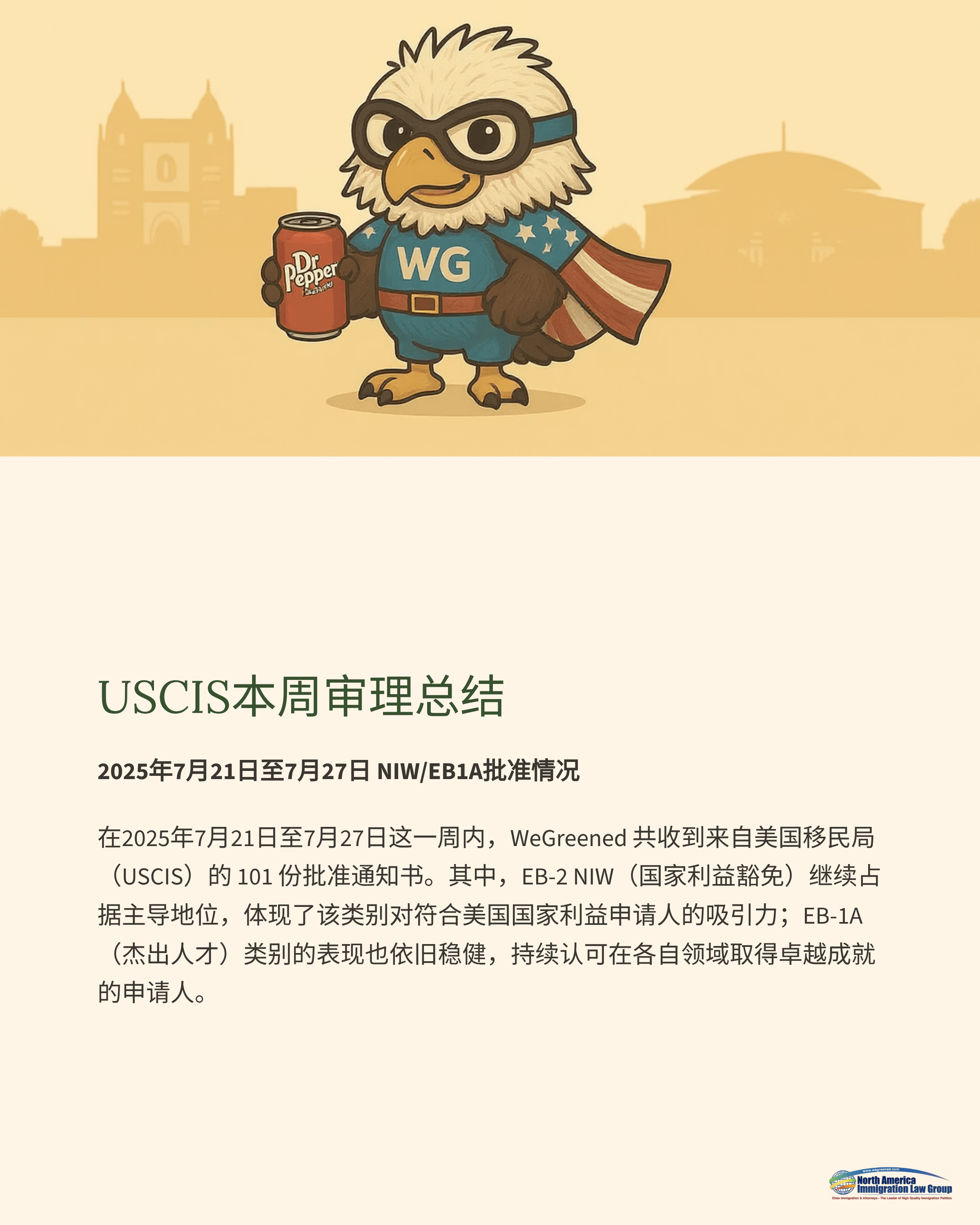 在2025年7月21日至7月27日这一周内,WeGreened 共收到来自美国移民局(USCIS)的 101 份批准通知书。其中,EB-2 NIW(国家利益豁免)继续占据主导地位,体现了该类别对符合美国国家利益申请人的吸引力;EB-1A(杰出人才)类别的表现也依旧稳健,持续认可在各自领域取得卓越成就的申请人。