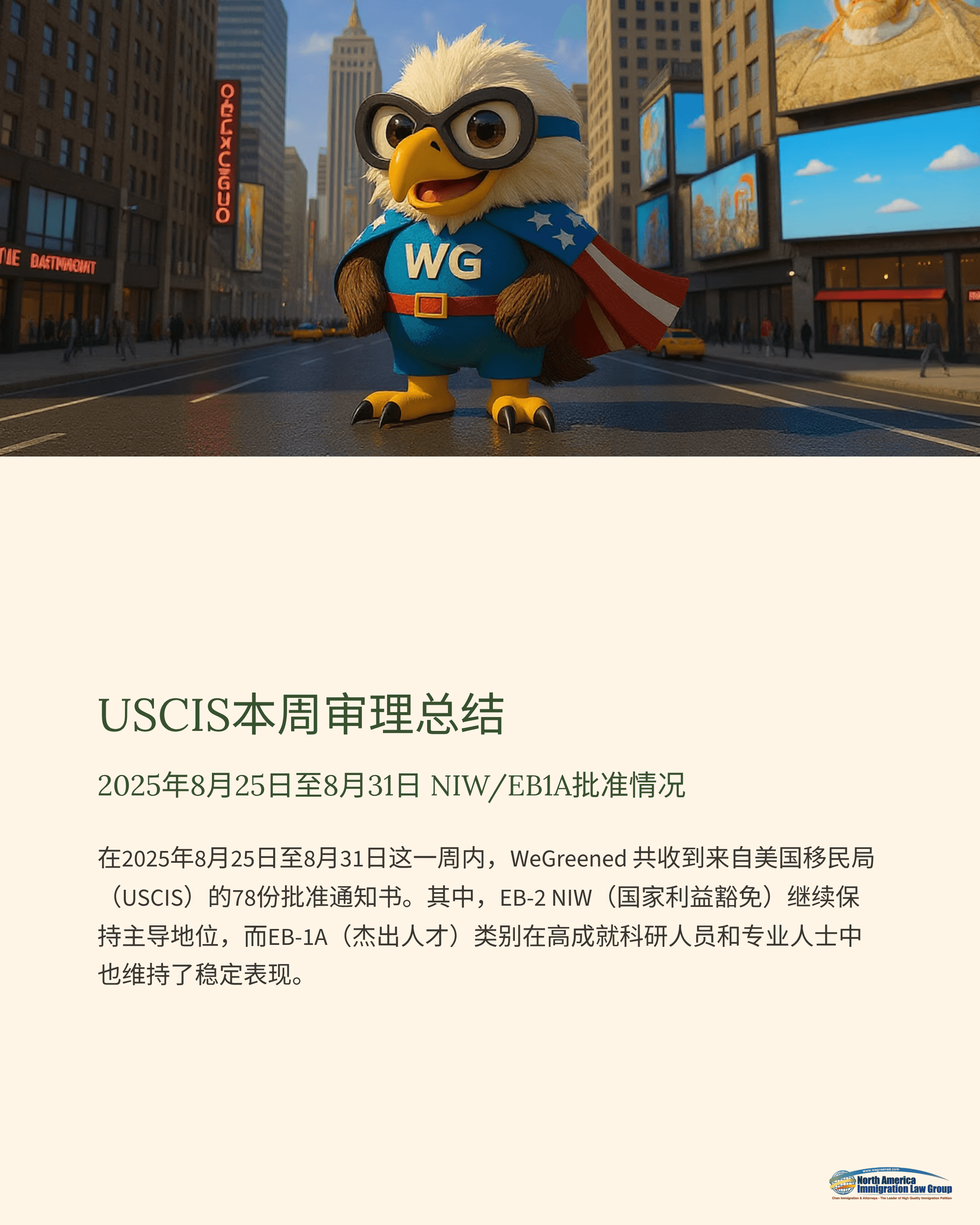 在2025年8月25日至8月31日这一周内,WeGreened 共收到来自美国移民局(USCIS)的78份批准通知书。其中,EB-2 NIW(国家利益豁免)继续保持主导地位,而EB-1A(杰出人才)类别在高成就科研人员和专业人士中也维持了稳定表现。