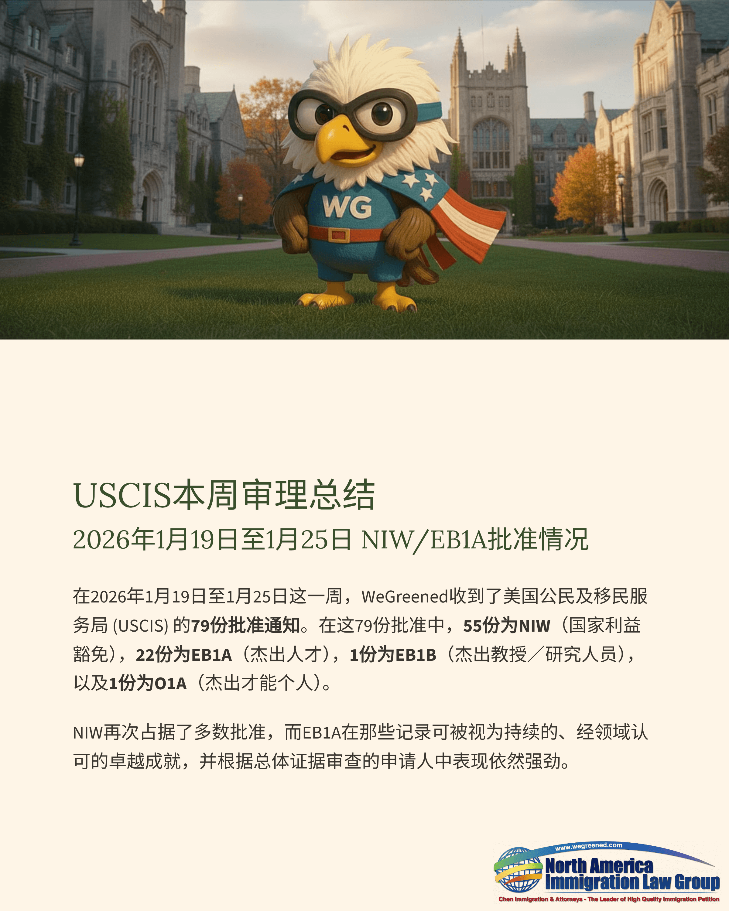 在2026年1月19日至2026年1月25日这一周内,WeGreened 共收到来自美国移民局(USCIS)的79份批准通知书。其中,NIW国家利益豁免)55件、EB1A杰出人才)22件、EB1B(杰出教授/研究人员)1件、O1A(杰出才能个人)1件。