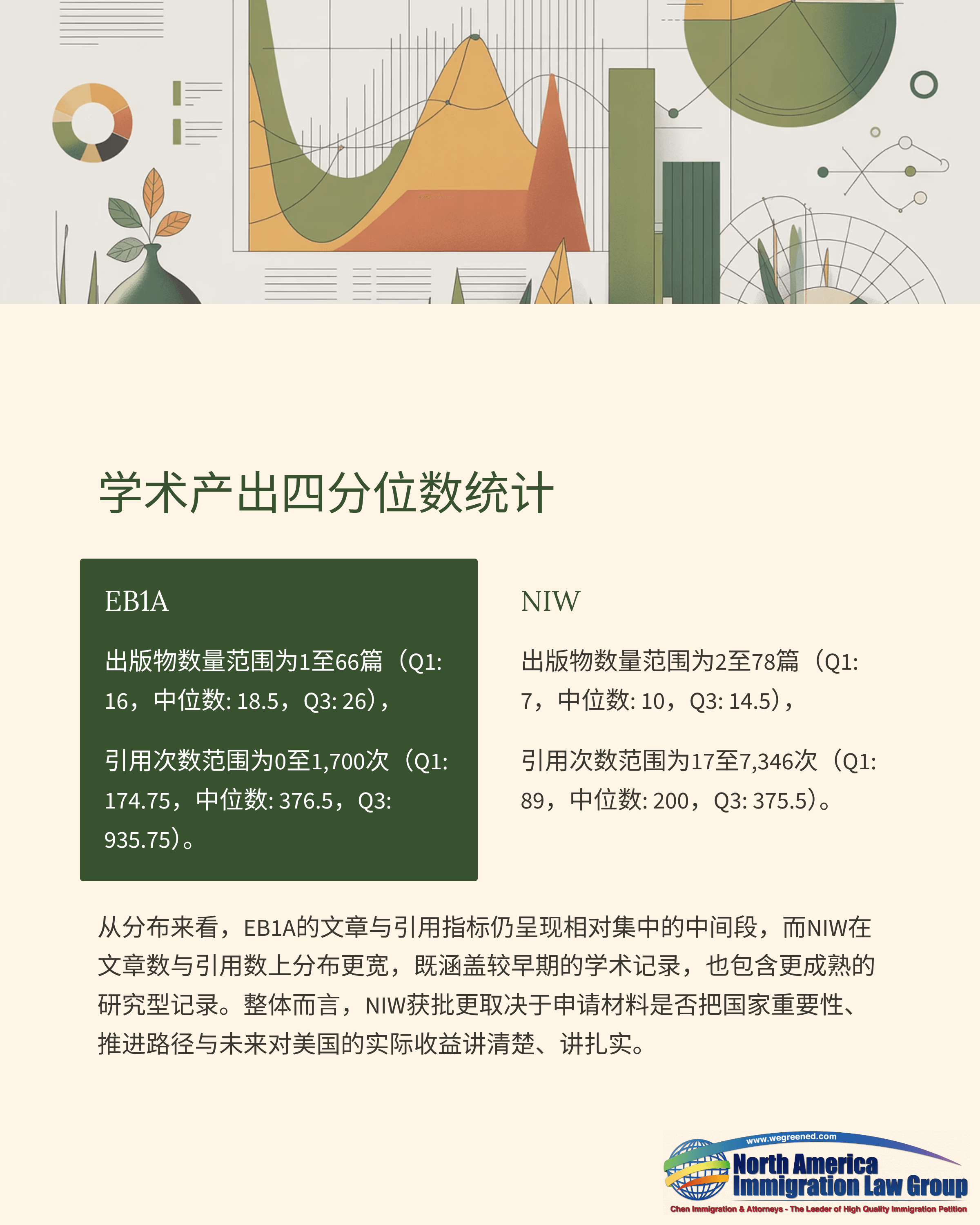 从分布来看,EB1A的文章与引用指标仍呈现相对集中的中间段,而NIW在文章数与引用数上分布更宽,既涵盖较早期的学术记录,也包含更成熟的研究型记录。整体而言,NIW获批更取决于申请材料是否把国家重要性、推进路径与未来对美国的实际收益讲清楚、讲扎实。