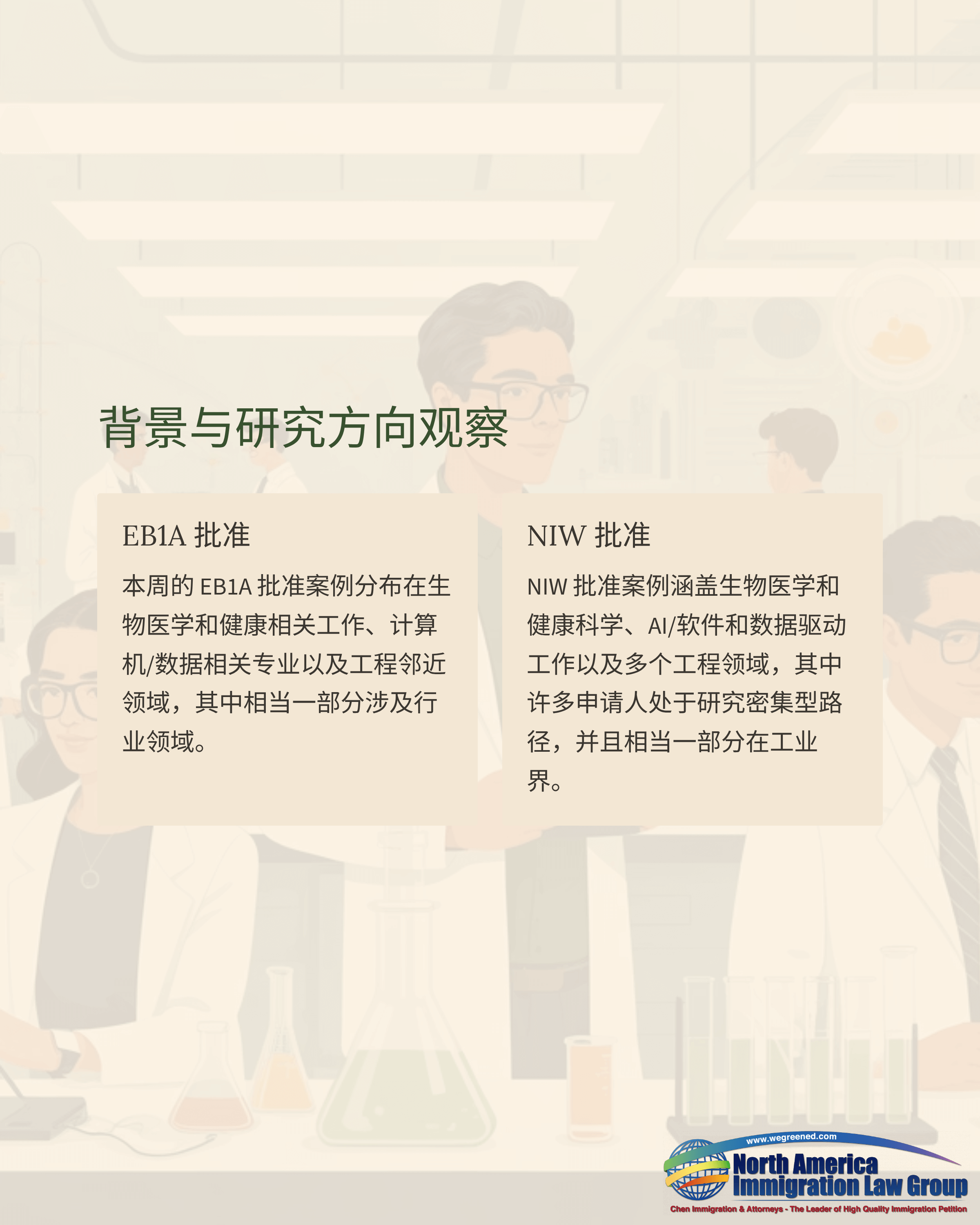 本周NIW获批覆盖生物医学与健康科学、AI/软件与数据驱动方向,以及多个工程类方向。申请人中既有博士后、研究岗位等研究型路径,也有相当比例来自产业界。整体来看,获批表现更强的NIW通常具备三个共性:方向定义清晰、已有进展具体可见、并能说明豁免如何放大对美国的整体收益。